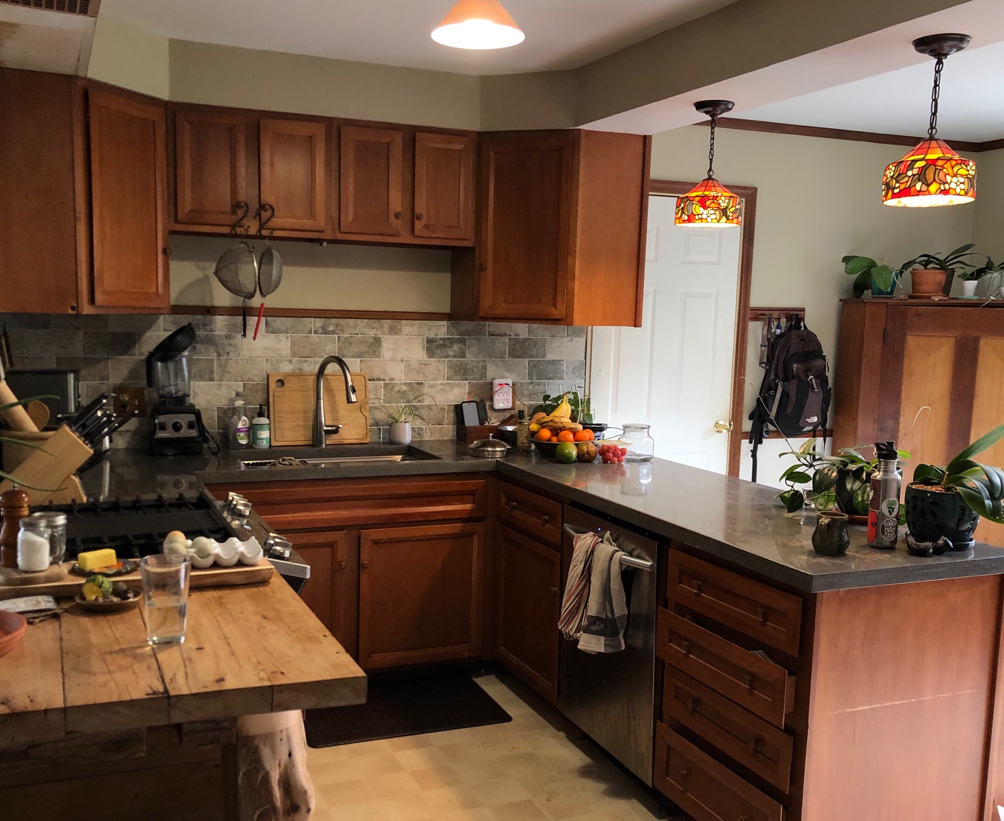 Concrete Countertop Installation + Fir-Trimmed & Woodburned Design Kitchen Cabinets