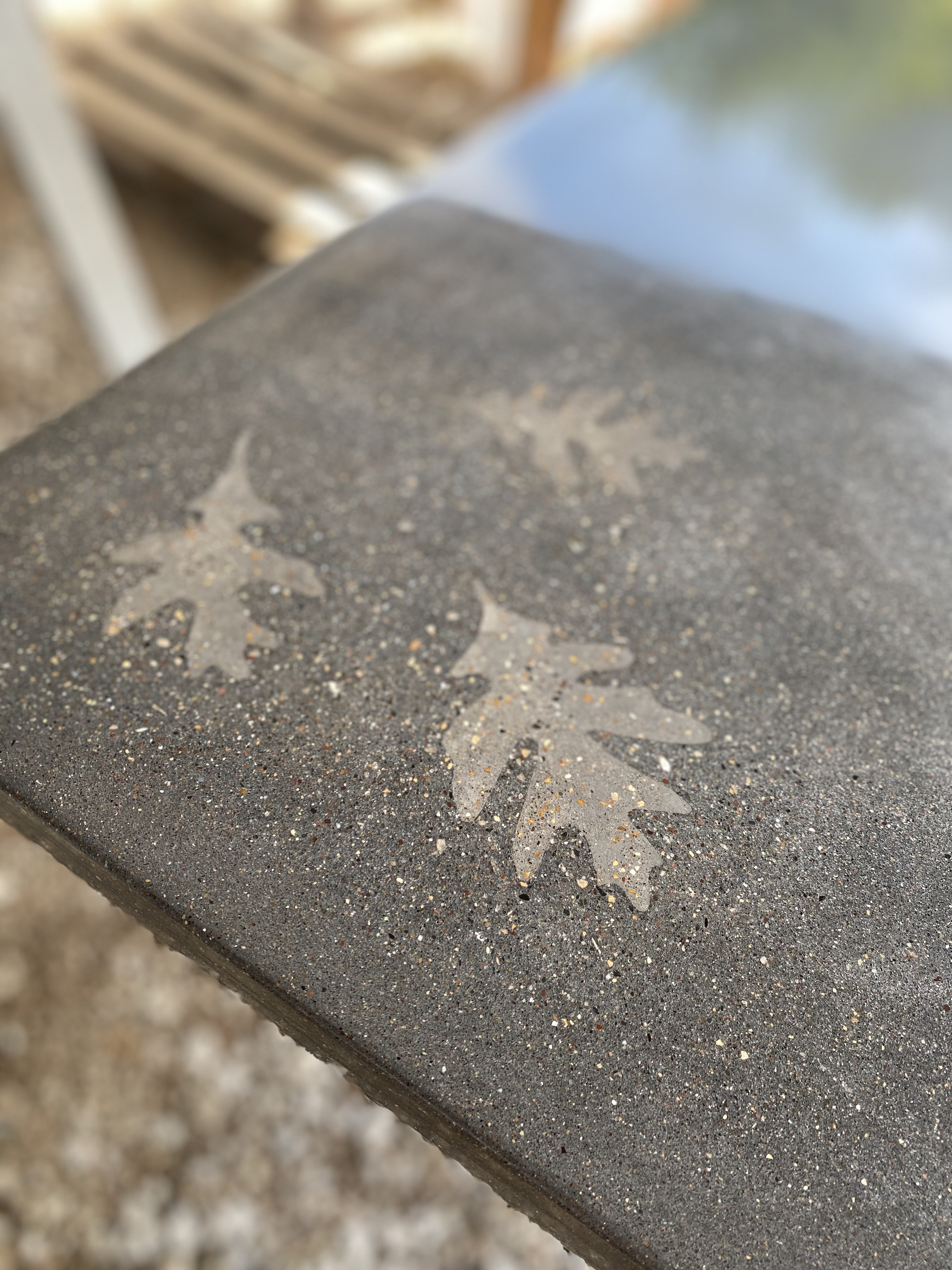 Concrete Countertop Installation – Clients Selected Oak Leaves from Their Yard to Incorporate Into Their Countertop Design